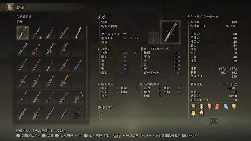 私は序盤から終盤まで「打刀 → 猟犬の長牙 → グランサクスの雷」と技量寄りのビルドで進めていましたが、ラスボス戦で行き詰まり、「キンバサ(筋力+祈祷)」ビルドに変更。